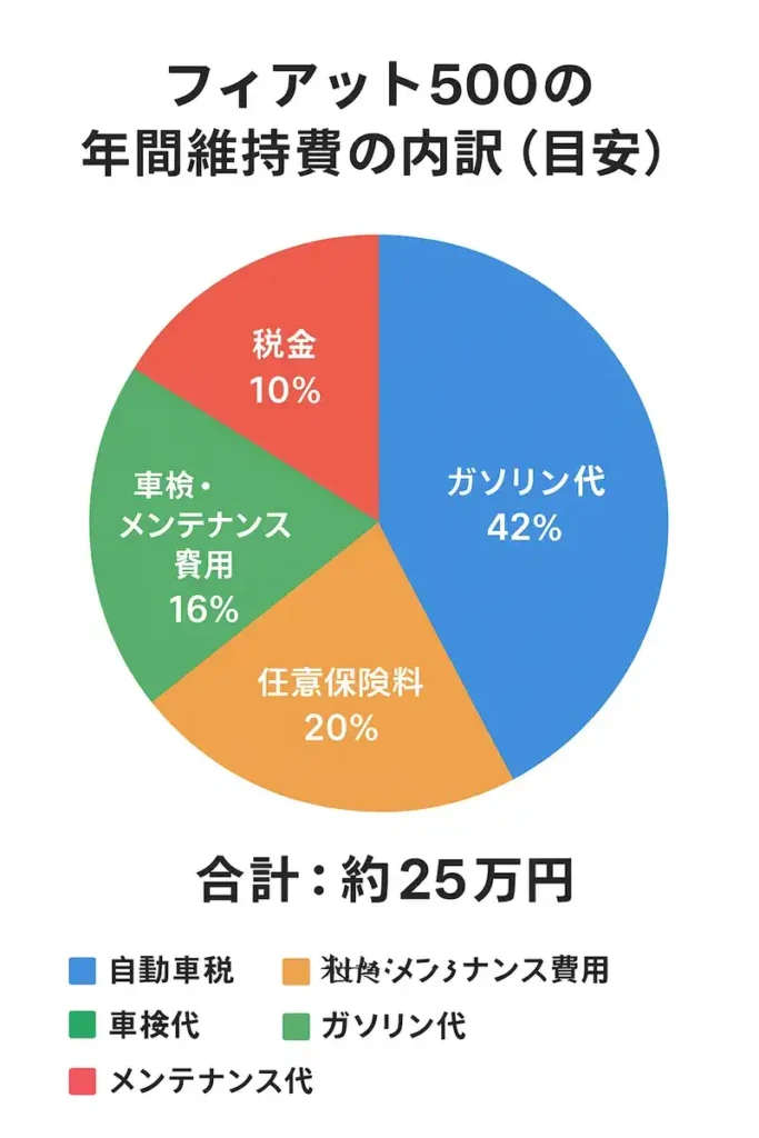 「フィアット500、かわいいけど維持費が高いのはちょっと…」そんな金銭的な不安をお持ちの方もいらっしゃるでしょう。特に「ハイオク仕様」という言葉を聞くと、ガソリン代だけでも負担が大きいのでは?と感じてしまうかもしれません。ここでは、フィアット500にかかるリアルな年間維持費を、具体的な数字でシミュレーションしてみましょう。