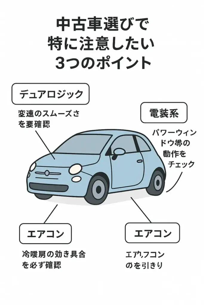 - 中古車選びでは整備履歴、特にデュアロジックの状態確認が最重要である